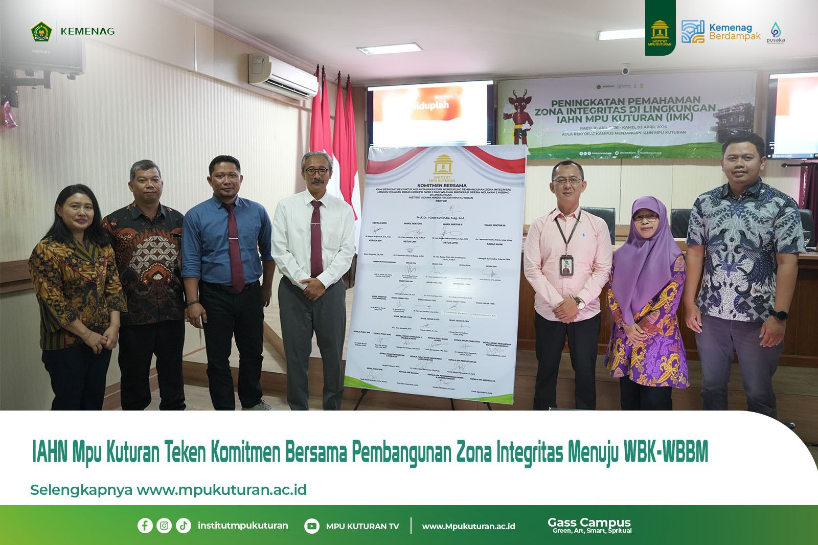 SINGARAJA, HUMAS — IAHN Mpu Kuturan (IMK) menegaskan komitmennya dalam membangun tata kelola birokrasi yang bersih dan melayani melalui penandatanganan komitmen bersama pembangunan Zona Integritas menuju Wilayah Bebas dari Korupsi dan Wilayah Birokrasi Bersih dan Melayani (WBK-WBBM), Rabu 1 April 2026